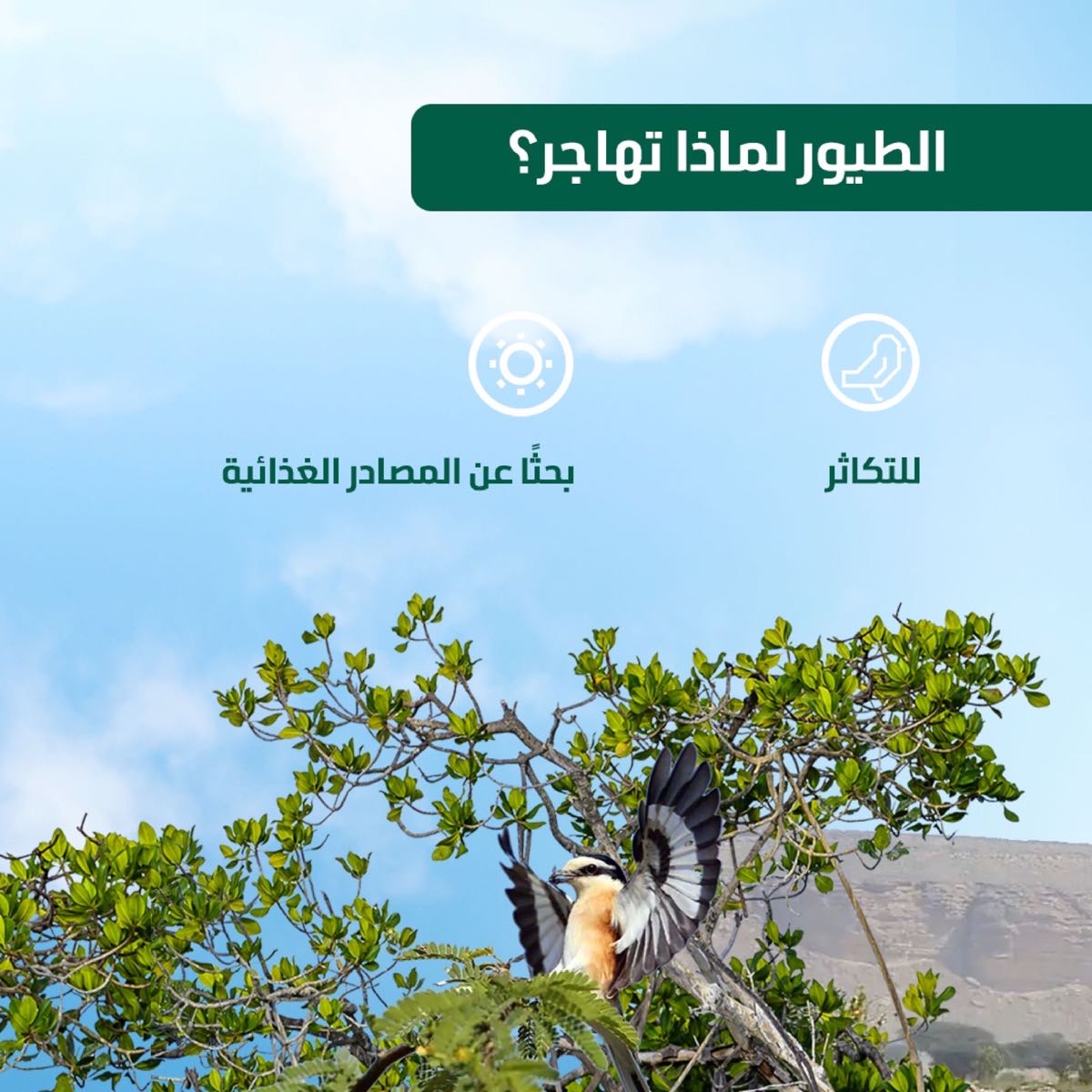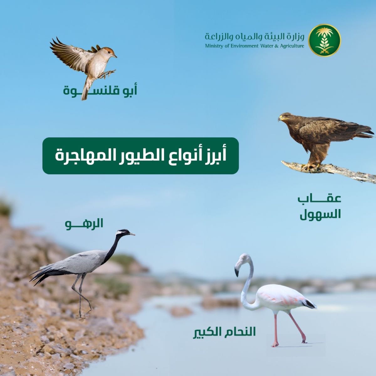 وأوضحت الوزارة في منشور لها بمناسبة اليوم العالمي للطيور المهاجرة، أن هذه الطيور تتنقل حول العالم سعياً للتكاثر، والبحث عن بيئات معتدلة المناخ، وفرص غذائية أفضل، لافتةً إلى أن المملكة تستضيف 280 نوعاً من الطيور المهاجرة، منها النحام الكبير، والرهو، وعقاب السهول، والعقاب الملكي الشرقي.