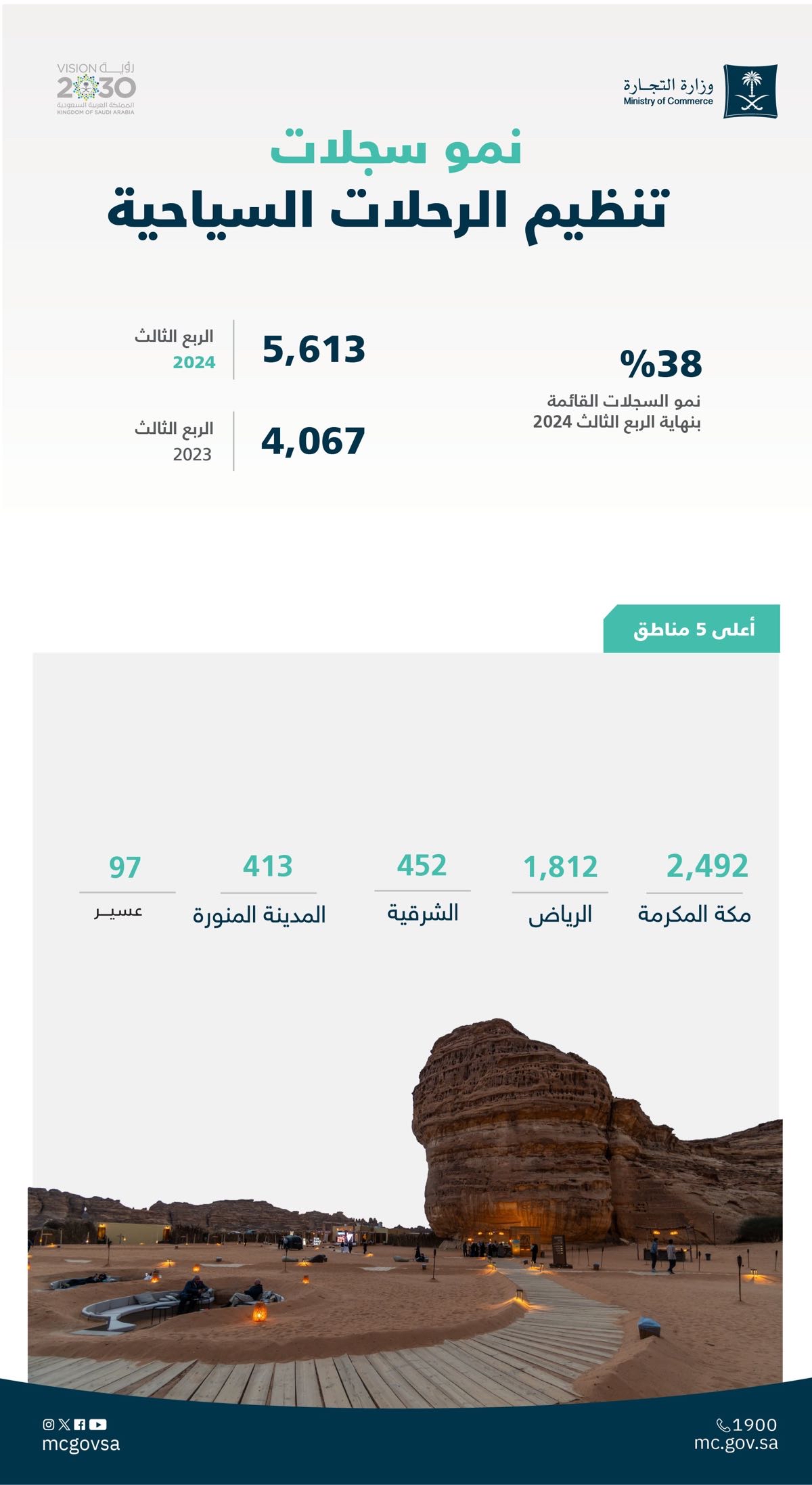 كشفت وزارة التجارة، عن نمو سجلات تنظيم الرحلات السياحية بالمملكة بنسبة 38 % بنهاية الربع الثالث من عام 2024 م.
