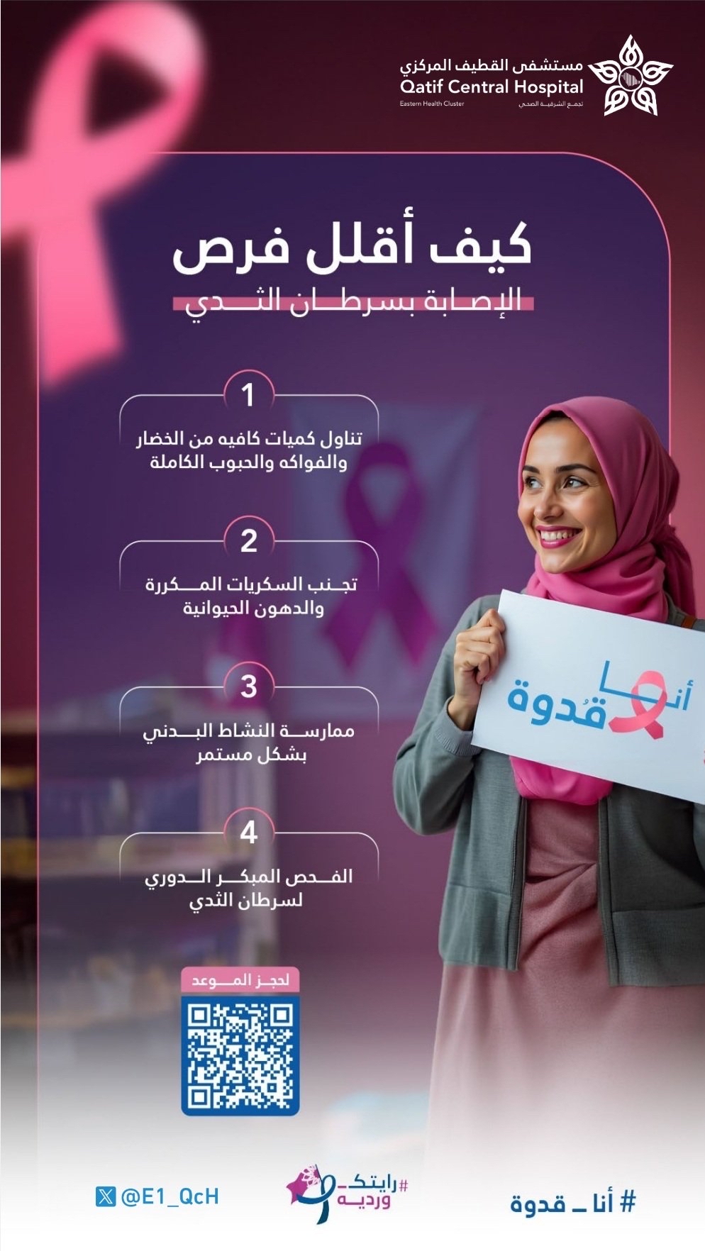 كشف مستشفى القطيف المركزي عن نصائح للسيدات للوقاية من سرطان الثدي، مؤكدًا على أهمية اتباع خطوات بسيطة تساهم في الحد من خطر الإصابة بهذا المرض.