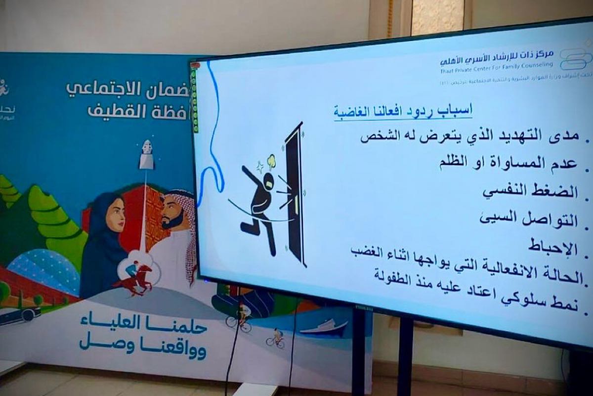 حضر 15 مستفيدًا ضمانيًا، ورشة عمل تحت عنوان ”الغضب - عواصفنا الداخلية“، والتي نفذها مكتب الضمان الاجتماعي بمحافظة القطيف، بالشراكة المجتمعية مع جمعية التنمية الأهلية بحلة محيش، وبالتعاون مع مركز ”ذات“ للإرشاد الأسري، بقاعة التأهيل والتدريب بالمكتب في حي الناصرة.