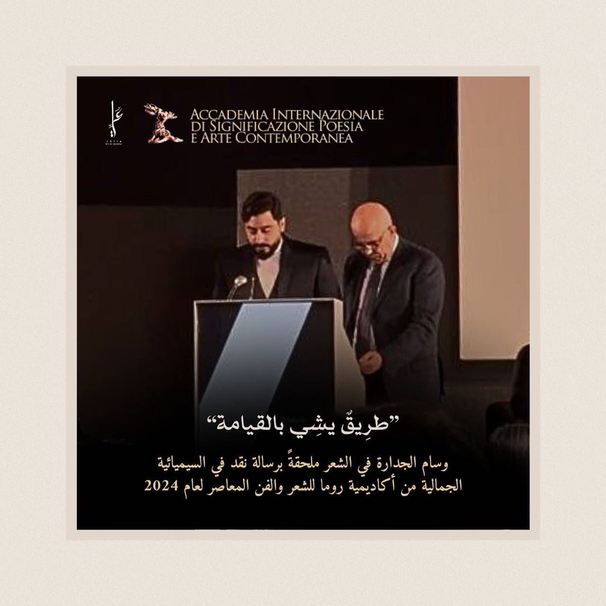 جاء ذلك ضمن مسابقةٍ دوليةٍ نظمتها الأكاديمية الدولية للشعر والفن المعاصر في روما بالتعاون مع المعهد الثقافي في نيويورك، بمشاركةٍ واسعةٍ تجاوزت الألف مُشارك.