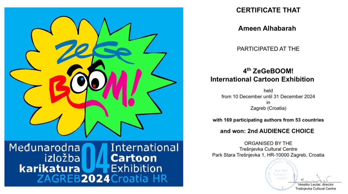 حقق فنان الكاريكاتير السعودي أمين الحبارة إنجازًا جديدًا يضاف إلى سلسلة إنجازاته، حيث فاز بالجائزة الثانية ضمن اختيار الجمهور في المعرض الدولي الرابع للكاريكاتير ”زي جي بوم“ الذي أقيم في العاصمة الكرواتية زغرب.