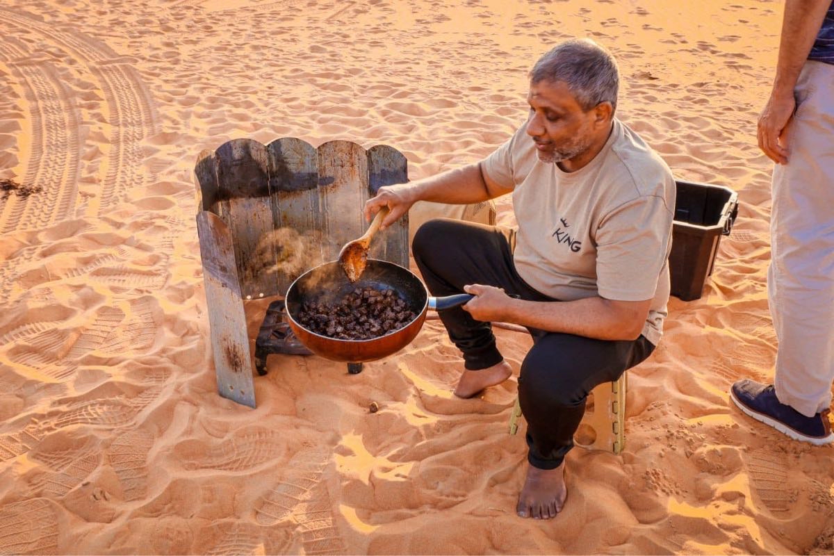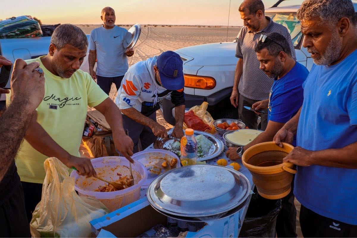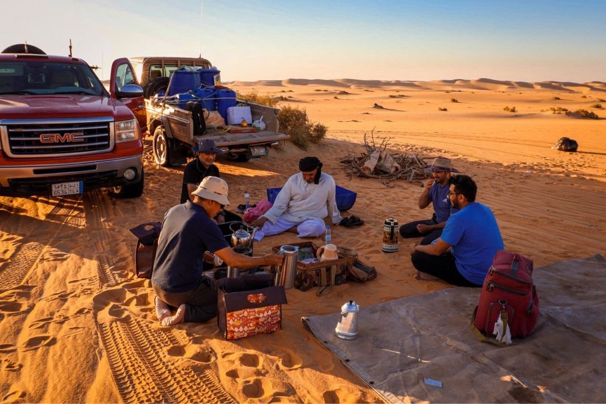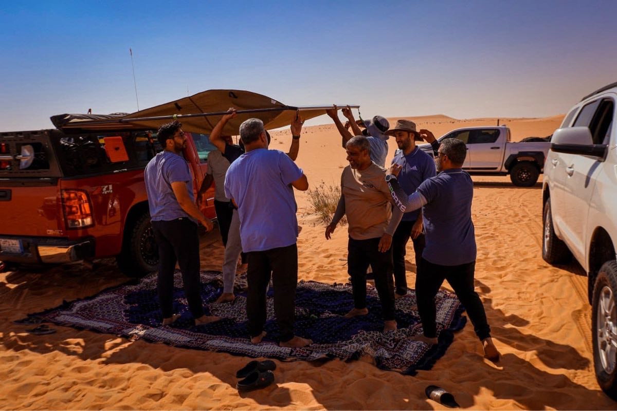 وأضاف يبدأ يوم المغامرين فجراً بالصلاة الجماعية، ثم تناول ”تصبيرة“ خفيفة قبل الفطور الرئيسي، وبعد ذلك، يفكك الفريق الخيام ويحمل المعدات في السيارات ليتوجه نحو وجهة جديدة. وخلال النهار، كانوا يتوقفون بشكل دوري للراحة، من خلال إعداد وجبات الغذاء أو العشاء، يليها تناول الشاي.