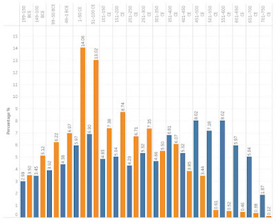رسم بياني يقارن النسبة المئوية لحطام السفن في كل نصف قرن، من إجمالي عدد السفن المحطمة في نصف البحر الأبيض المتوسط، وفقًا لقواعد بيانات هارفارد ومراجعة أكسفورد للسياسات الاقتصادية OXREP يمثل اللون البرتقالي غرب البحر الأبيض المتوسط، بينما يمثل اللون الأزرق شرق البحر الأبيض المتوسط. المصدر: لي? كوسينز Lev Cosijns وحاغي أولشانيتسكي.