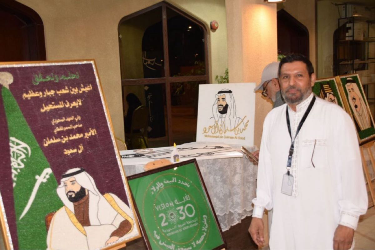 كما يشارك في السوق، الفنان والحرفي حسين الدهيم، الذي يمتلك موهبة فريدة في تطعيم الآيات القرآنية والشخصيات بالخرز والكريستال.