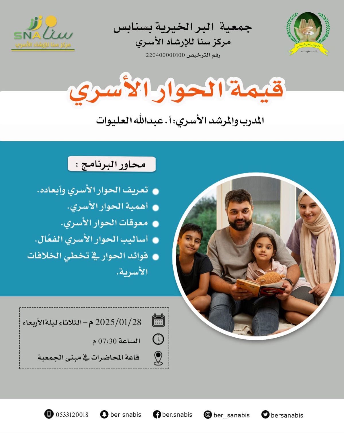 ”قيمة الحوار الأسري“.. محاضرة تثقيفية بسنابس الثلاثاء المقبل