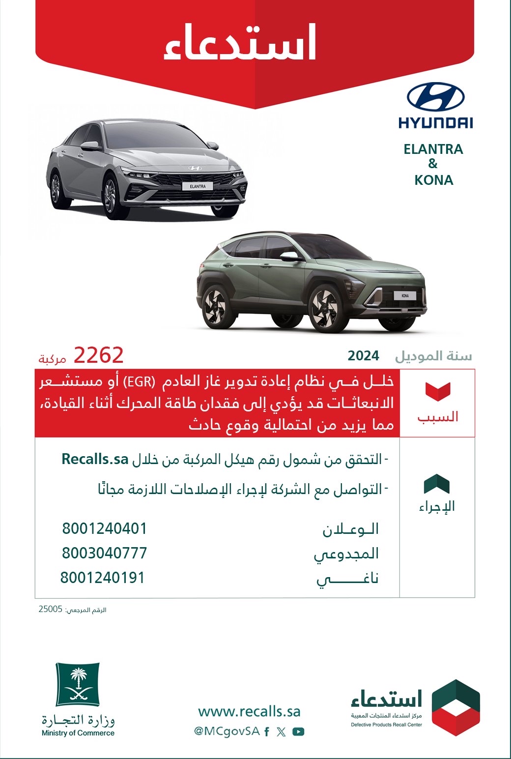 ودعت وزارة التجارة جميع مالكي مركبات هيونداي إلنترا وكونا المتأثرة إلى التحقق من شمول مركباتهم عبر الموقع الإلكتروني لمركز استدعاء المنتجات المعيبة Recalls.sa, والتواصل الفوري مع الوكلاء المعتمدين لشركة هيونداي في المملكة لإجراء الفحوصات والإصلاحات اللازمة مجانًا.