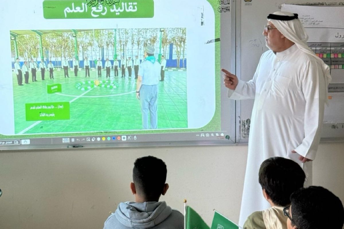 لم يقتصر الاحتفاء على ذلك، بل خُصصت الدقائق العشر الأولى من الحصص الدراسية، للحديث عن التطور التاريخي للعلم السعودي، منذ تأسيس الدولة وحتى الوقت الحاضر.