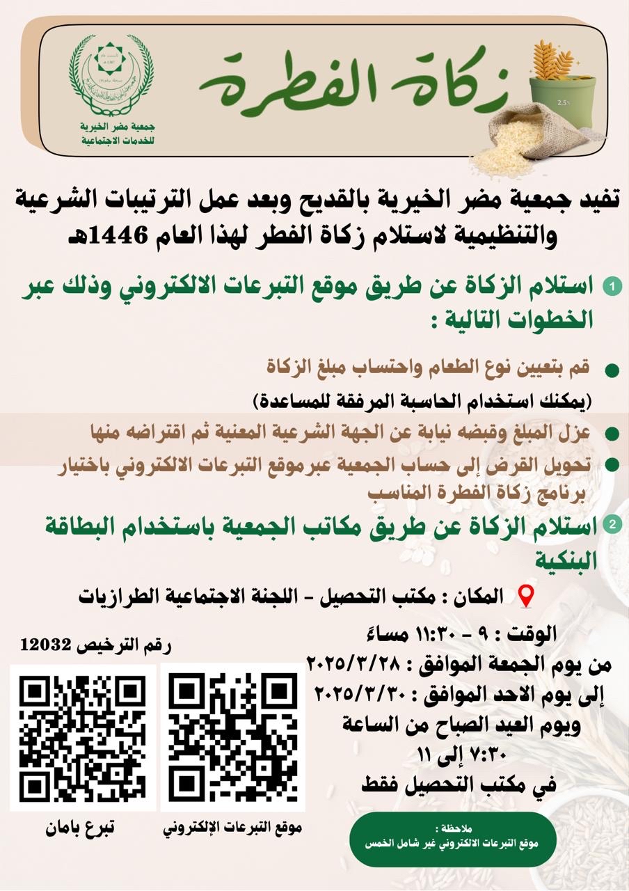 كما سيتم استقبال الزكاة صباح يوم عيد الفطر المبارك، الأول من شوال 1446 هـ الموافق للحادي والثلاثين من مارس 2025 م، ابتداءً من الساعة السابعة والنصف صباحًا وحتى الساعة الحادية عشرة صباحًا.