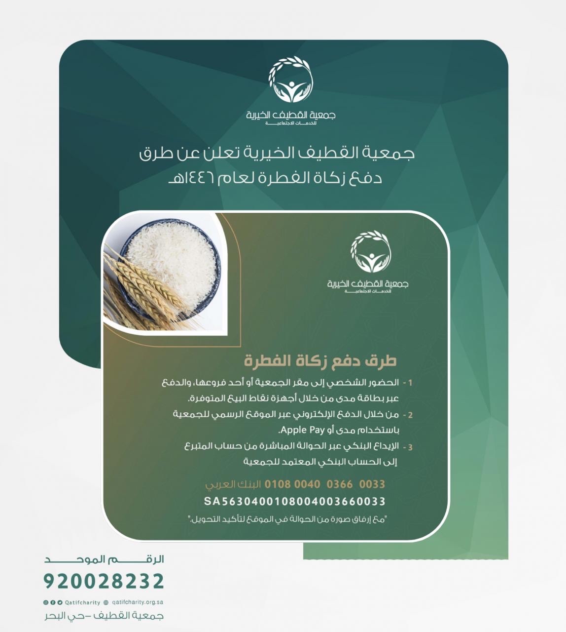 أعلنت جمعية القطيف الخيرية عن الآليات المعتمدة لاستقبال زكاة الفطرة للعام الهجري 1446، مؤكدةً حرصها على توفير خيارات دفع آمنة وسريعة تسهل على المزكين إخراج زكاتهم وتضمن وصولها إلى مستحقيها في الوقت الشرعي المحدد.