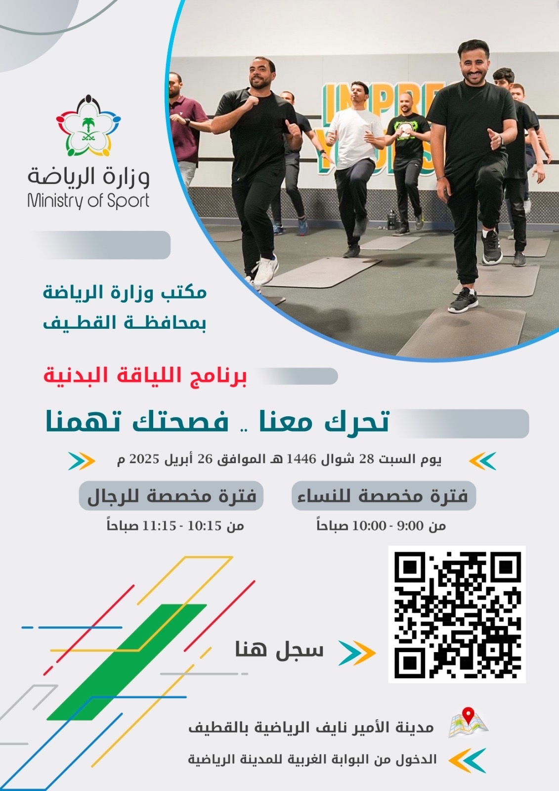 ينظم مكتب وزارة الرياضة بمحافظة القطيف برنامج متخصص في اللياقة البدنية، وذلك يوم السبت القادم، 28 شوال - 26 أبريل.