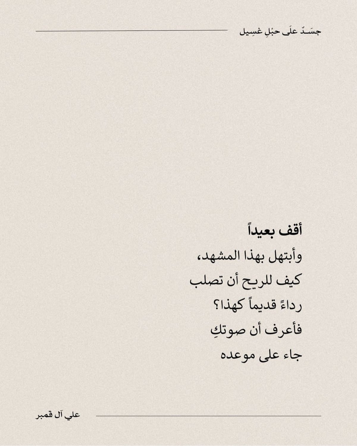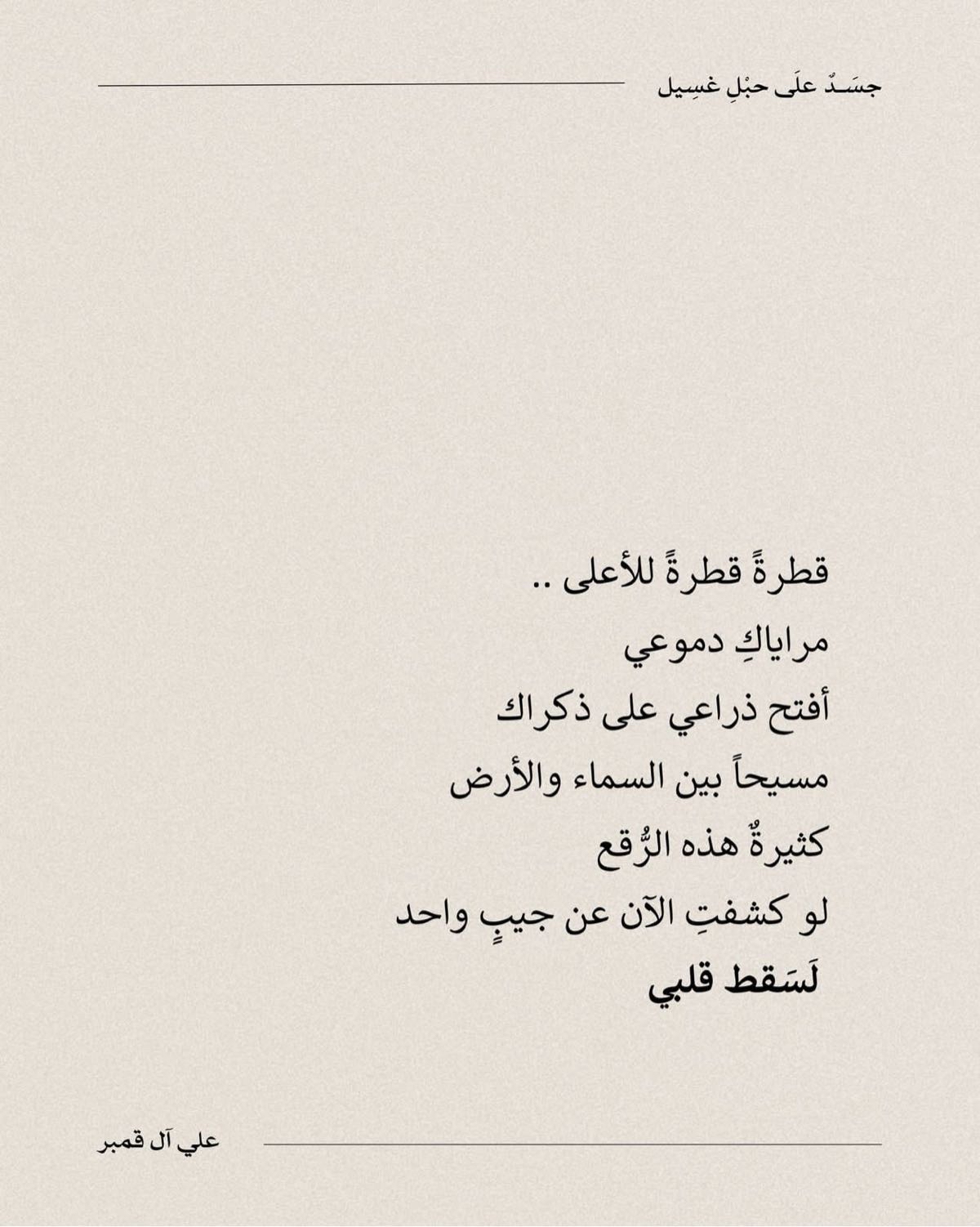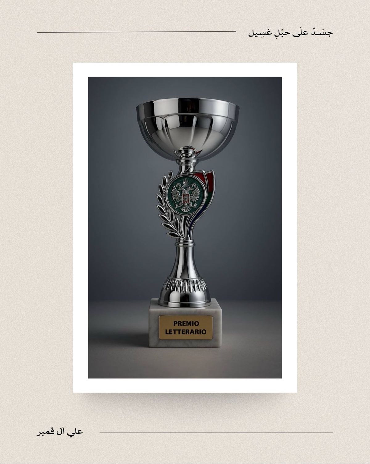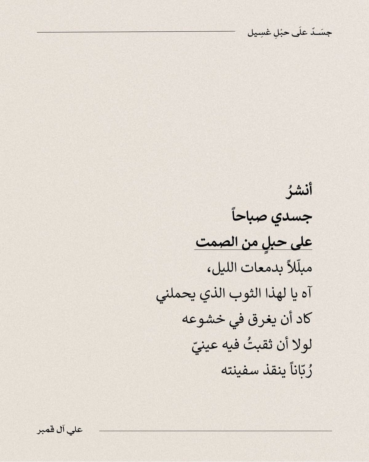 جاء هذا التتويج للشاعر آل قمبر عن قصيدته التي حملت عنوان ”جسدٌ على حَبل غَسيل“، والتي نجحت في التفوق على مئات الأعمال المشاركة من شعراء ينتمون لمختلف دول العالم.