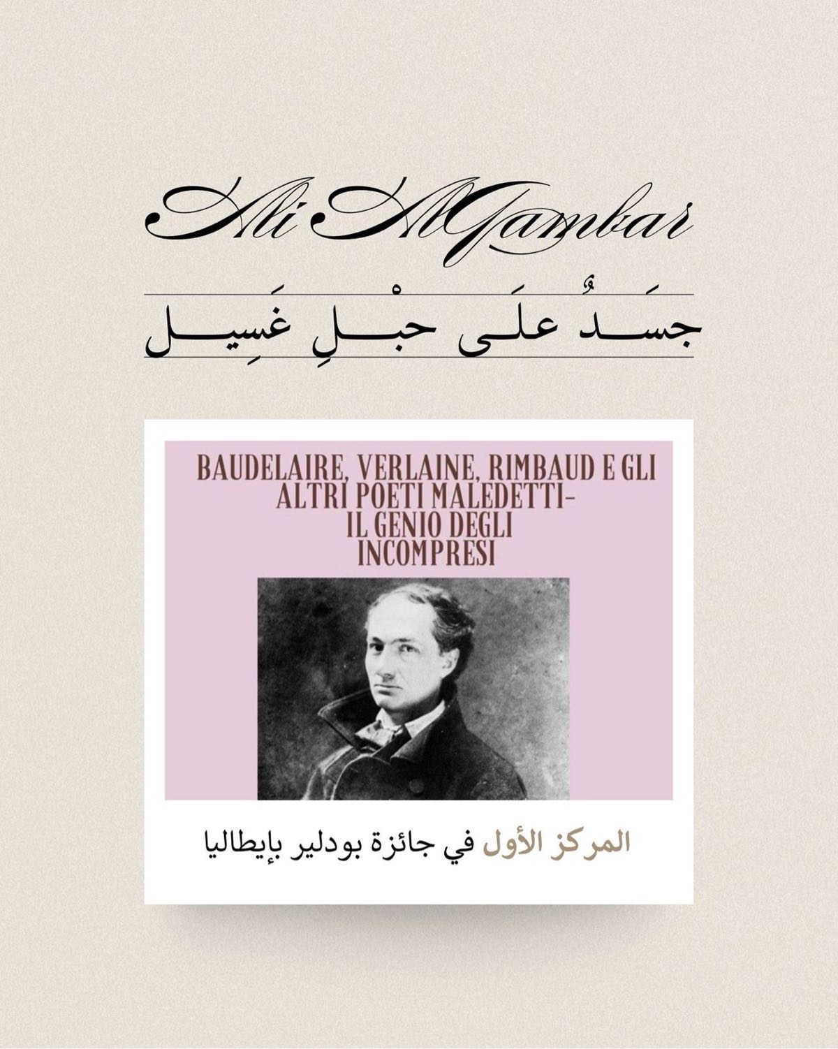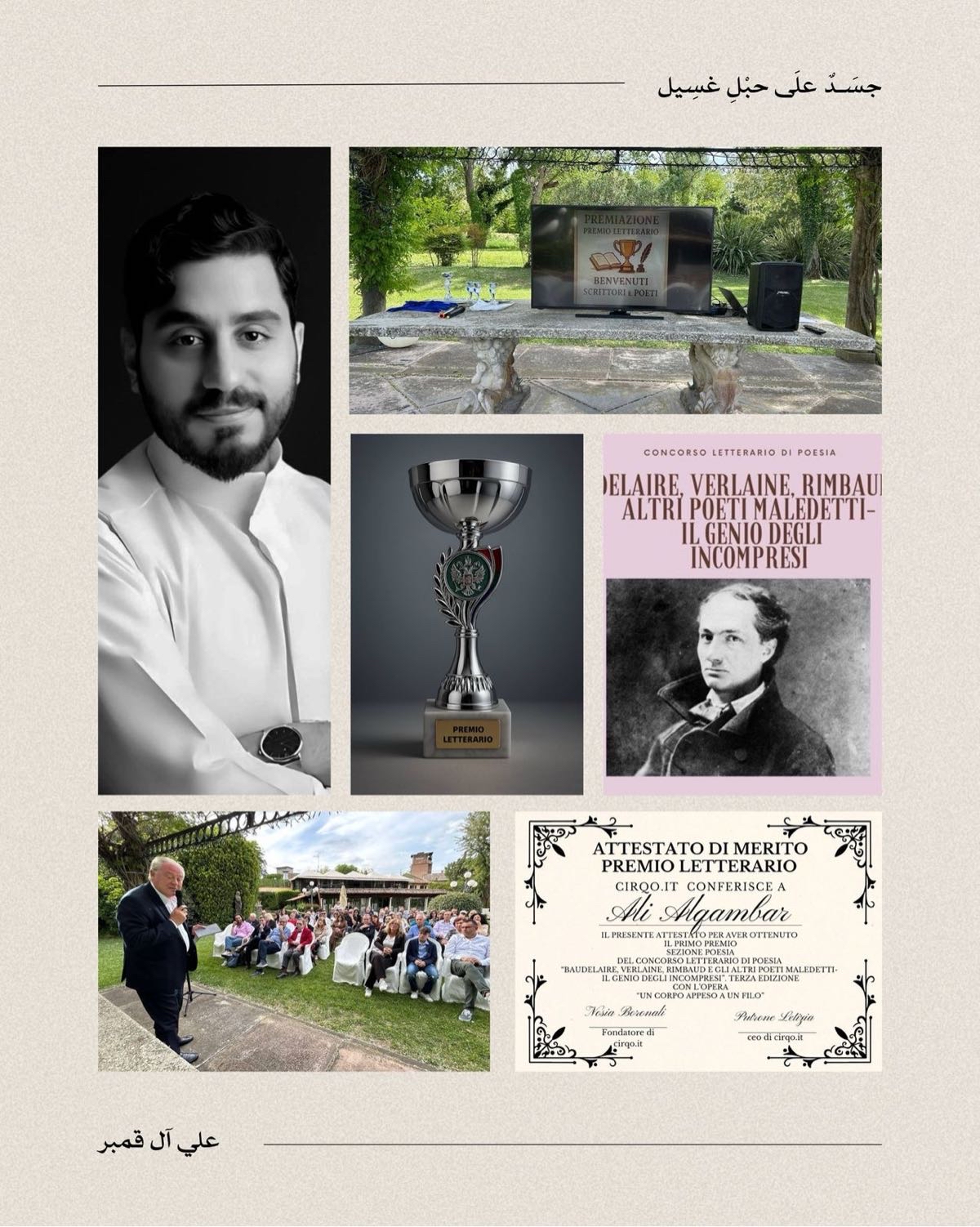 حقق الشاعر السعودي علي آل قمبر، المركز الأول في فئة الشعر ضمن مسابقة بودلير الدولية، وذلك خلال حفل تكريم أقيم يوم أمس في مدينة ريميني الإيطالية الساحلية.
