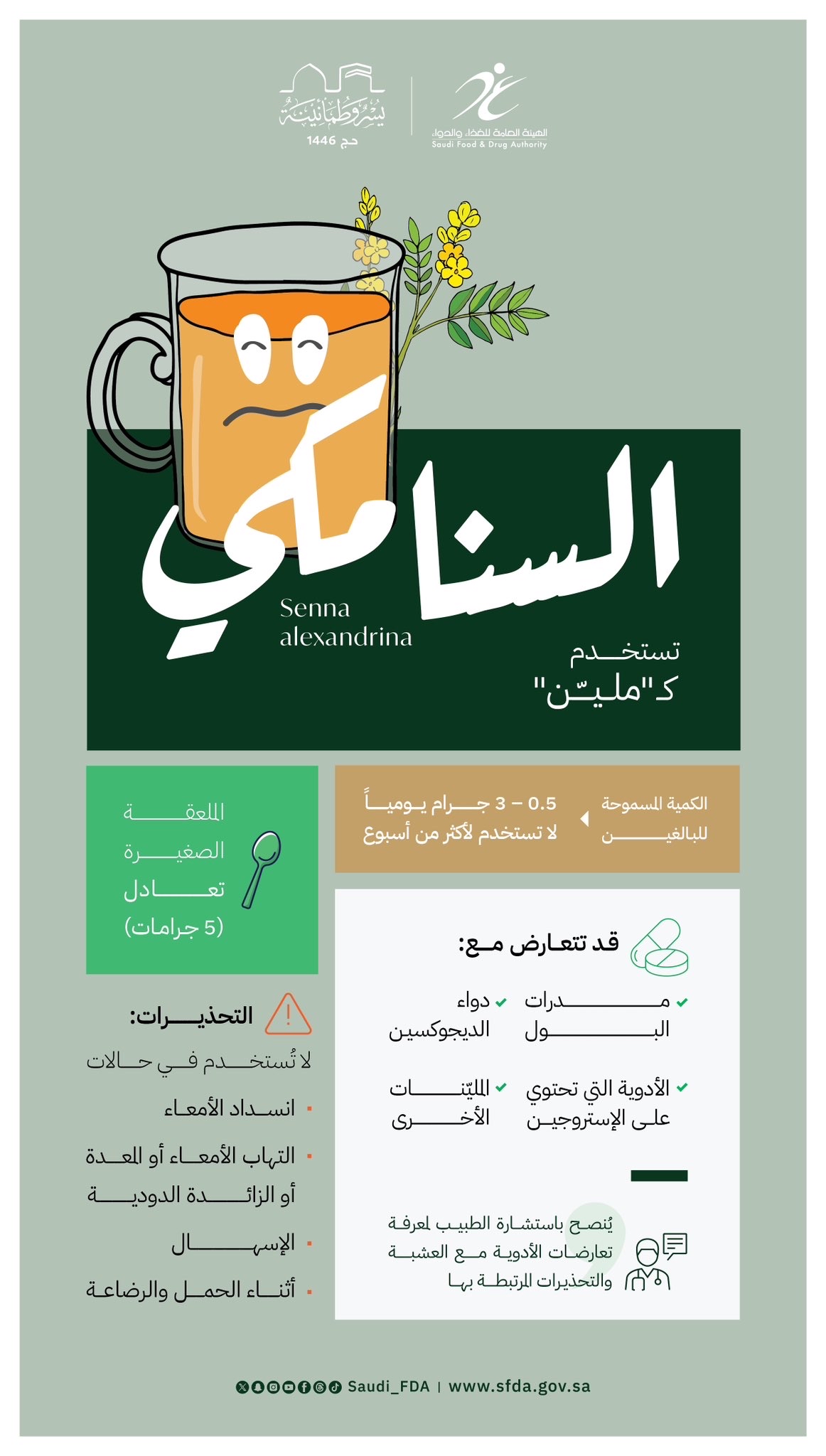 ونبهت الهيئة إلى نقطة هامة تتعلق بالكميات، حيث أشارت إلى أن ملعقة صغيرة واحدة قد تحتوي على ما يعادل خمسة جرامات «5 جرامات» من السنا، وهي كمية تتجاوز الجرعة اليومية القصوى الموصى بها، مما يستدعي انتباهاً دقيقاً عند تحضير الجرعة.