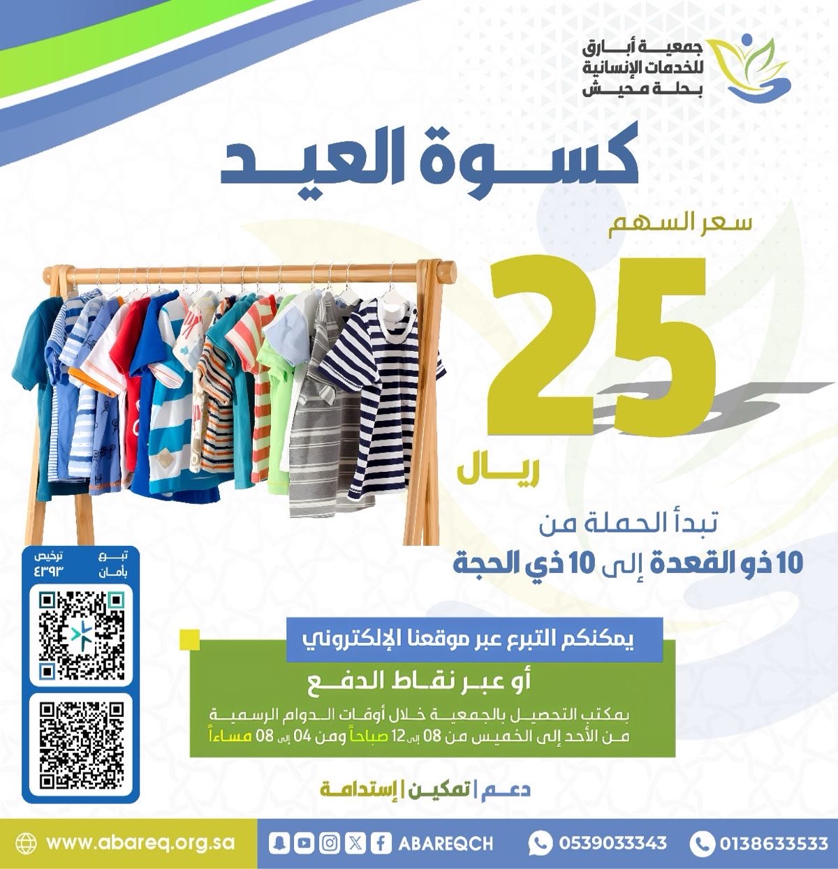 اطلقت جمعية أبارق للخدمات الإنسانية بحلة محيش حملتها الموسمية ”كسوة العيد“، الهادفة إلى توفير ملابس جديدة للأسر المستفيدة، وذلك استعدادًا لاستقبال عيد الأضحى المبارك.