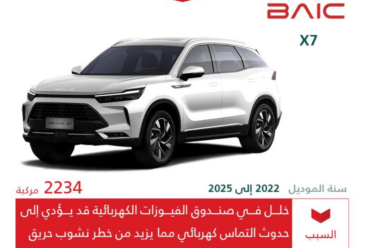 أعلنت وزارة التجارة، اليوم الإثنين، عن استدعاء 2,234 مركبة من نوع بايك X7، تشمل موديلات الأعوام الممتدة من 2022 حتى 2025.