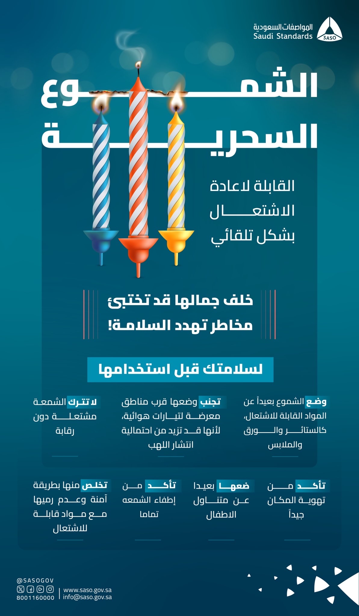 حذّرت الهيئة السعودية للمواصفات والمقاييس والجودة من مخاطر استخدام ما يُعرف بـ ”الشموع السحرية“ القابلة لإعادة الاشتعال تلقائيًا.