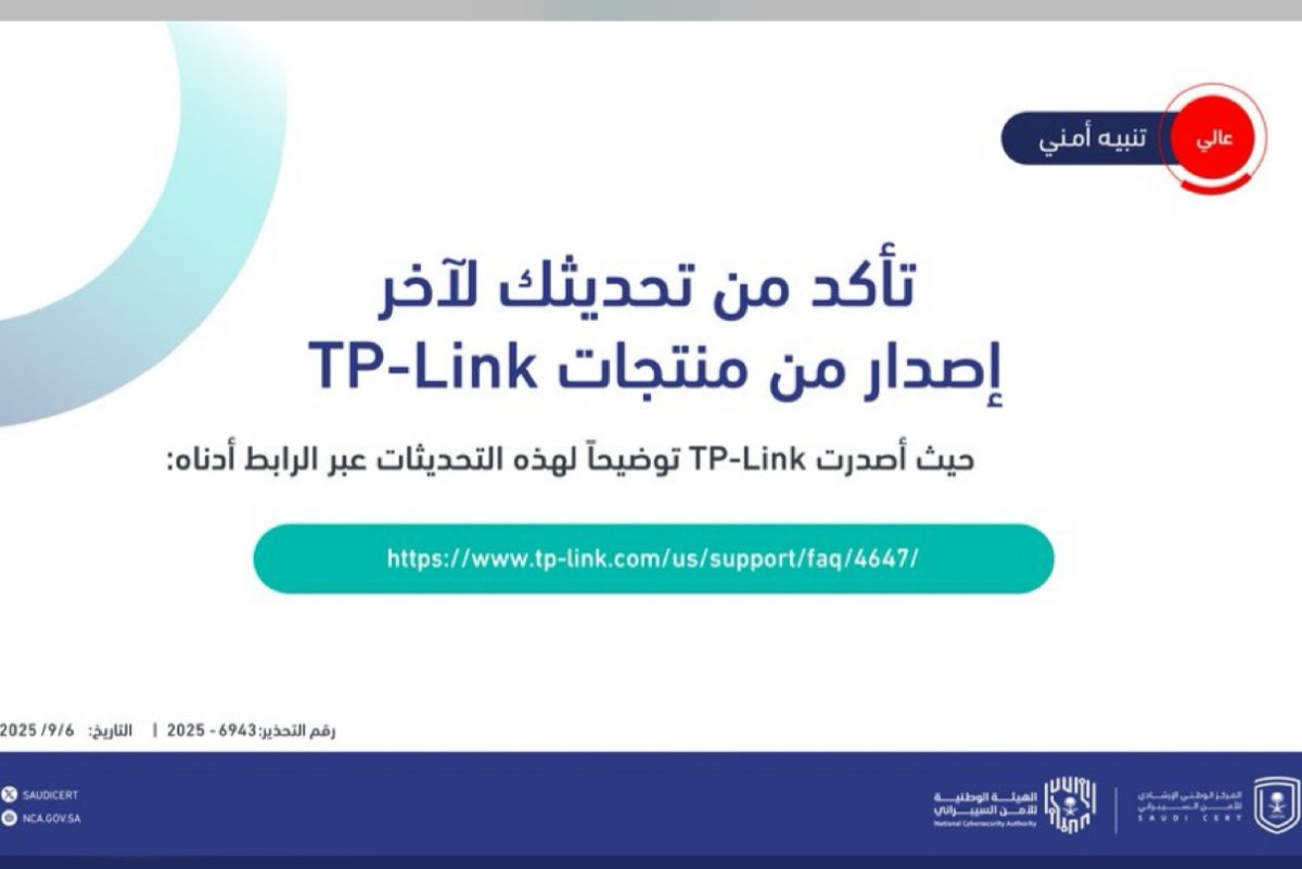 جاء ذلك بشأن اكتشاف ثغرات أمنية في عدد من منتجات شركة ”TP-Link“ الشهيرة، داعياً كافة الجهات والمستخدمين إلى اتخاذ الإجراءات الوقائية اللازمة بشكل فوري.