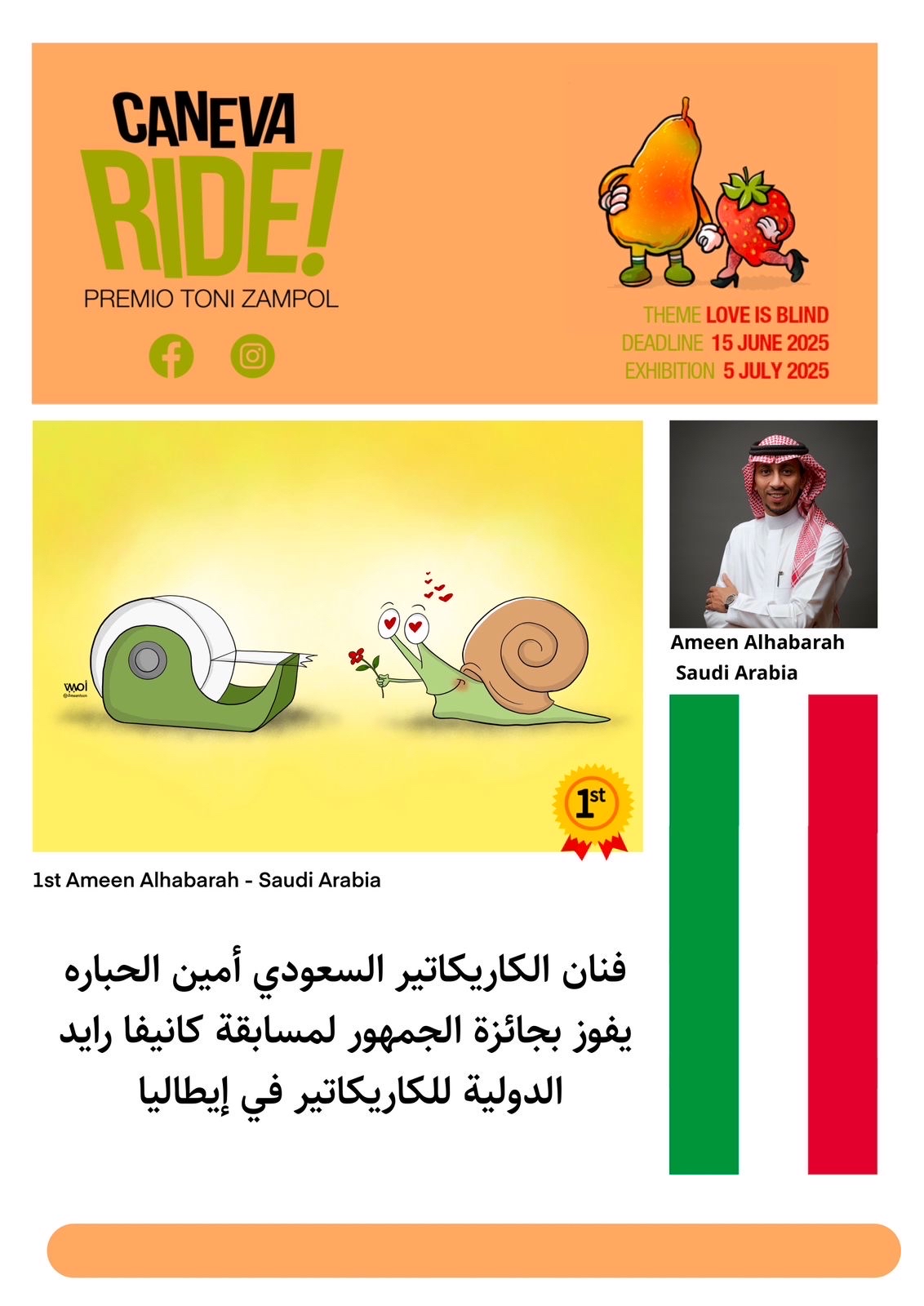حقق فنان الكاريكاتير السعودي، أمين الحبارة، إنجازاً دولياً جديداً يضاف إلى مسيرته الفنية الحافلة، بفوزه بجائزة الجمهور في مسابقة ”كانيفا رايد“ الدولية للكاريكاتير في إيطاليا.