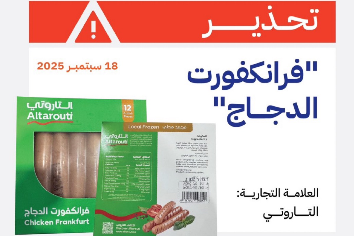 حذرت الهيئة العامة للغذاء والدواء المستهلكين بتجنب استهلاك منتج ”فرانكفورت الدجاج“ الذي يحمل العلامة التجارية ”التاروتي“، وذلك بعد أن أثبتت التحاليل المخبرية تلوثه ببكتيريا قد تشكل خطراً على الصحة العامة.