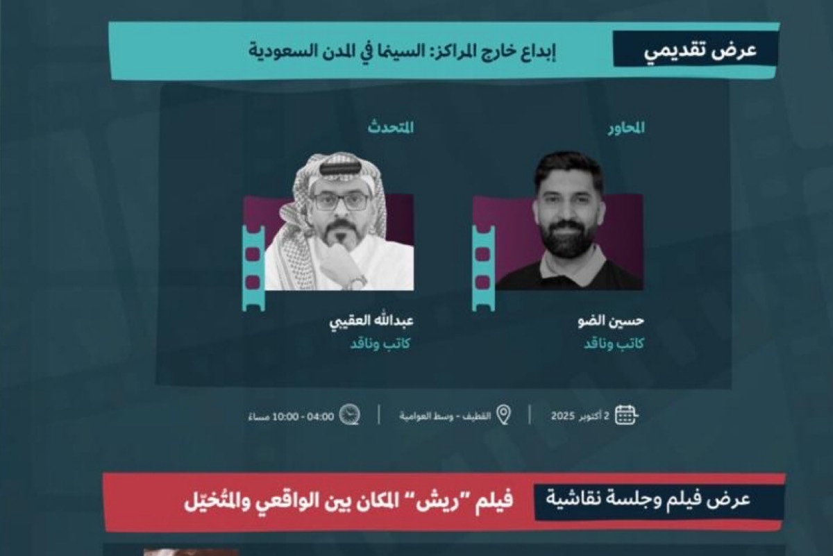 كما سيقدم الكاتبان حسين الضو وعبدالله العقيبي عرضًا تقديميًا حول ”إبداع خارج المراكز: السينما في المدن السعودية“.