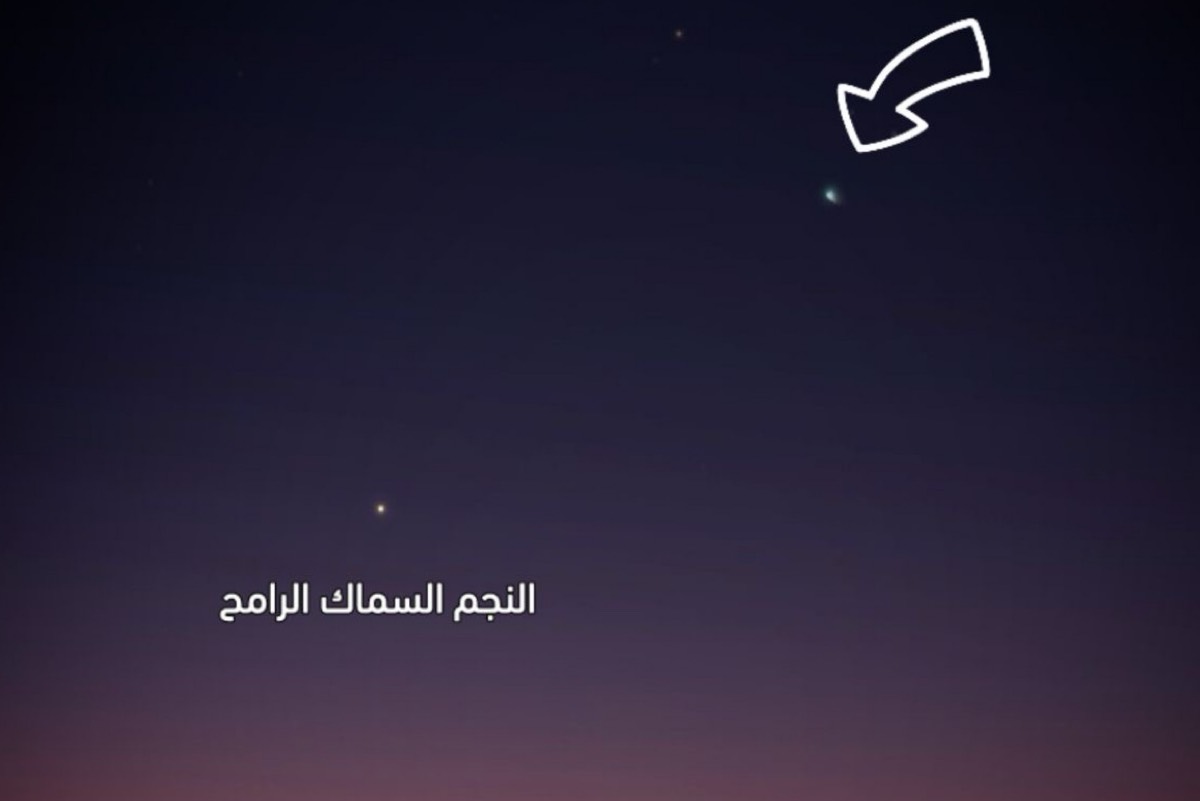 ولتسهيل عملية الرصد، أوضح أبو زاهرة أن المذنب سيبدأ بالظهور بعد حوالي ساعة من غروب الشمس، حيث سيُشاهد منخفضاً نحو الأفق الغربي الشمالي الغربي، في موقع قريب من النجم اللامع ”السماك الرامح“.