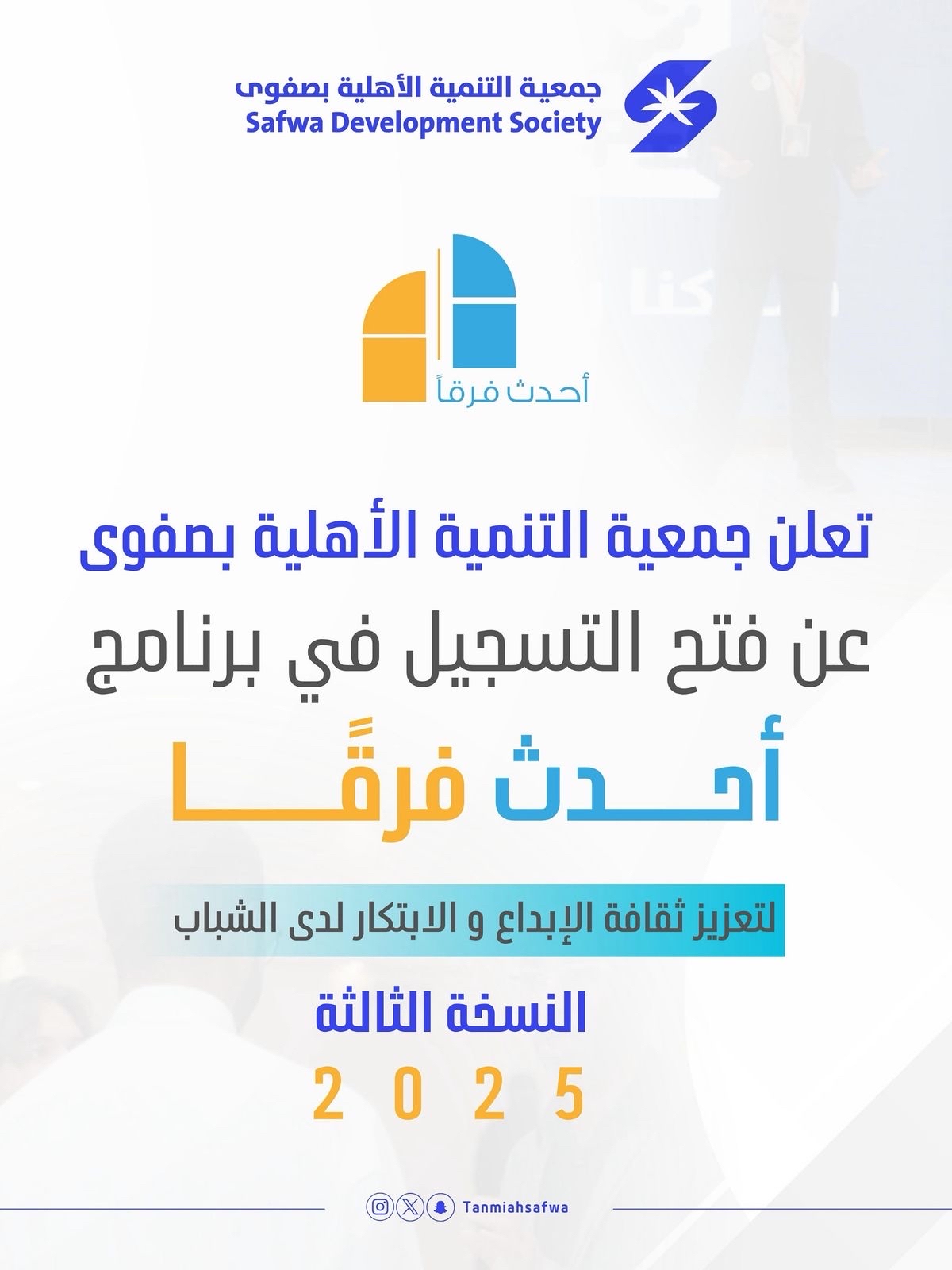 أعلنت جمعية التنمية الأهلية بصفوى عن فتح باب التسجيل في النسخة الثالثة من برنامج ”أحدث فرقًا“ لعام 2025، الموجه لتعزيز ثقافة الإبداع والابتكار لدى فئة الشباب.