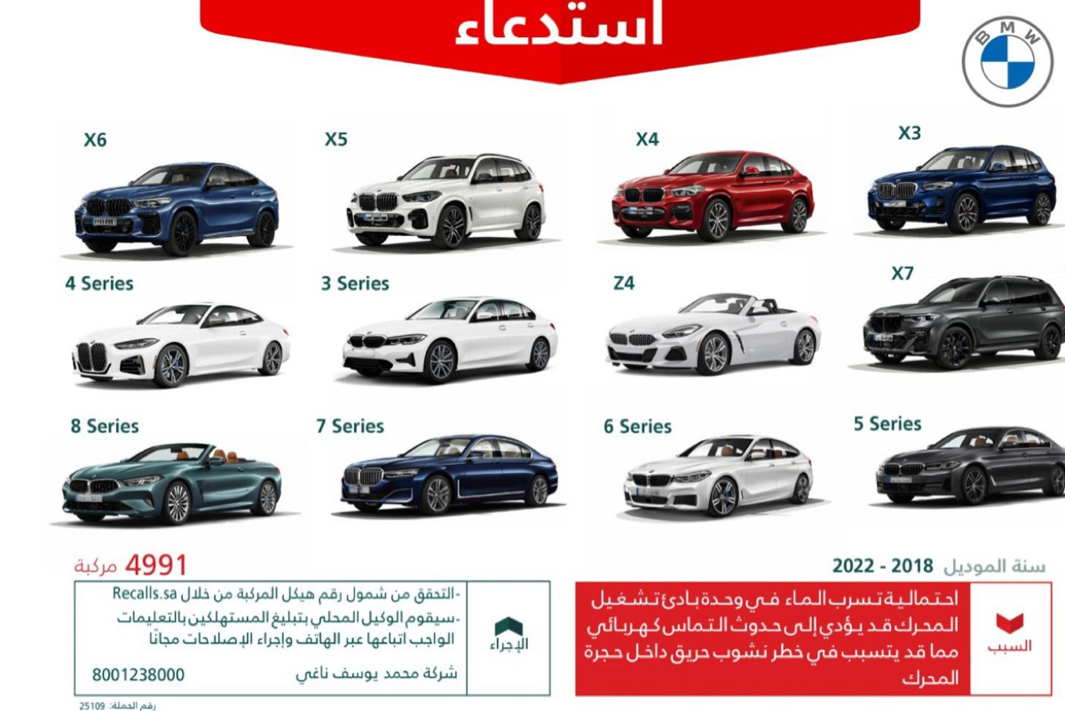 أعلنت وزارة التجارة عن استدعاء 4,991 مركبة من طرازات متعددة لسيارات BMW, تشمل موديلات الأعوام 2018 إلى 2022.