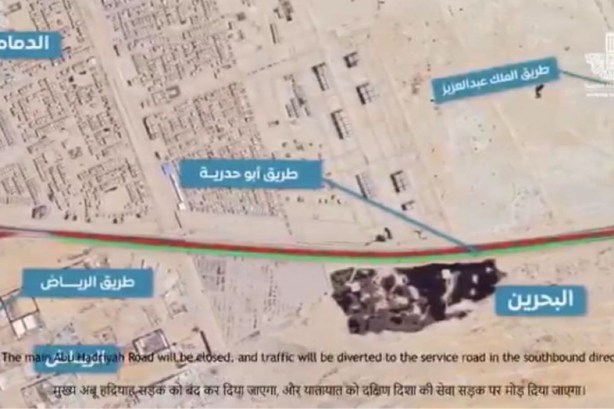 ولتسهيل التدفق المروري وضمان انسيابية حركة المركبات خلال فترة الأعمال، سيتم إغلاق المنعطف ”اللوب“ العلوي القادم من الدمام عبر جسر طريق الرياض والمتجه جنوباً.