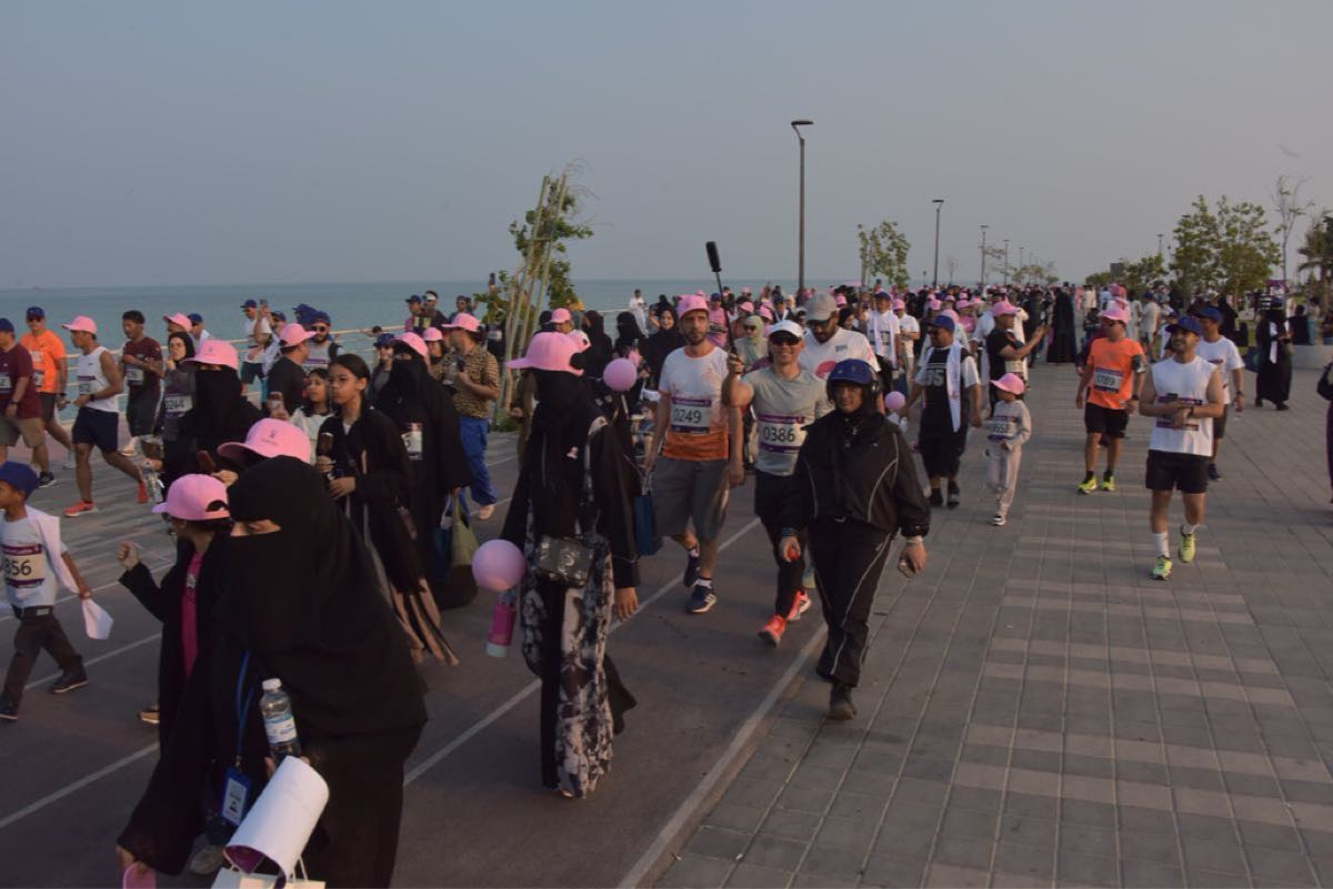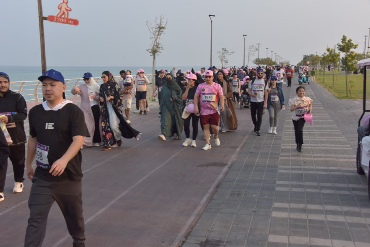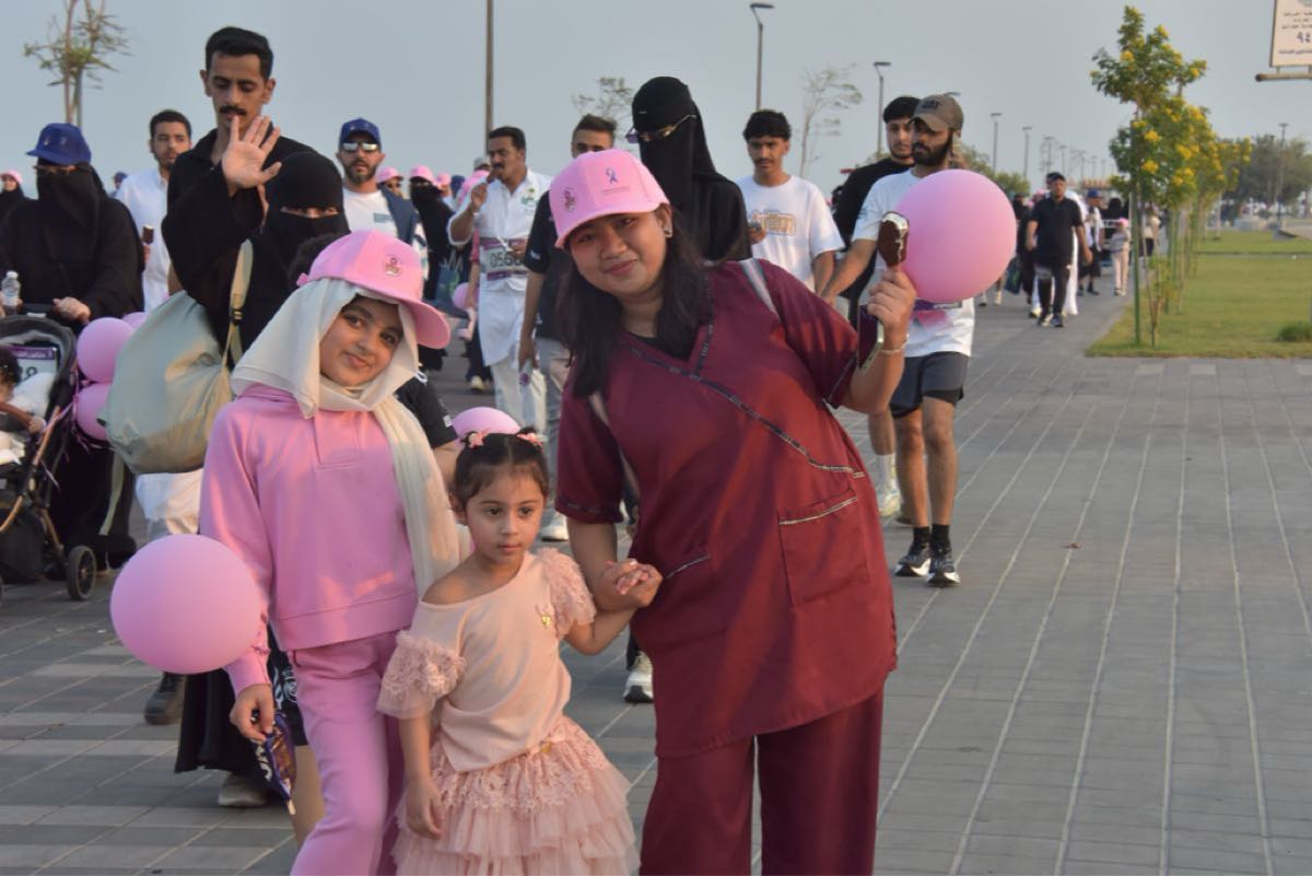 وشاركت جمعيات خيرية وجاليات متنوعة، وزينت سماء الكورنيش أكثر من 500 بالون وردي رمزاً للأمل. وتولت الجهات الأمنية والهلال الأحمر السعودي تنظيم السلامة وسير الحركة.