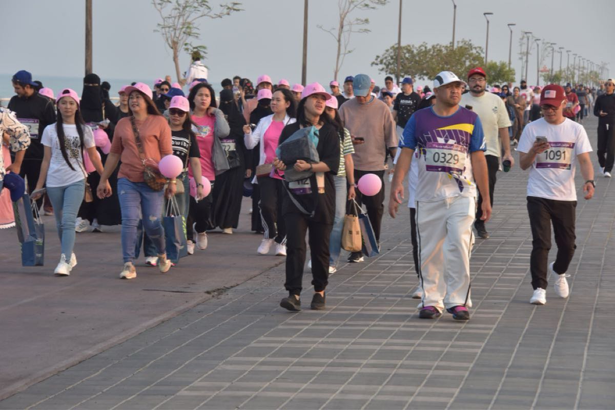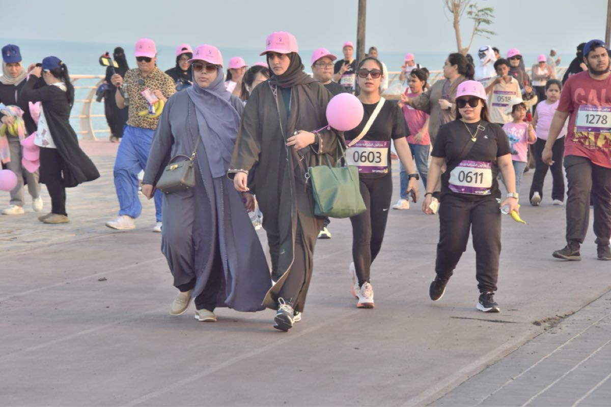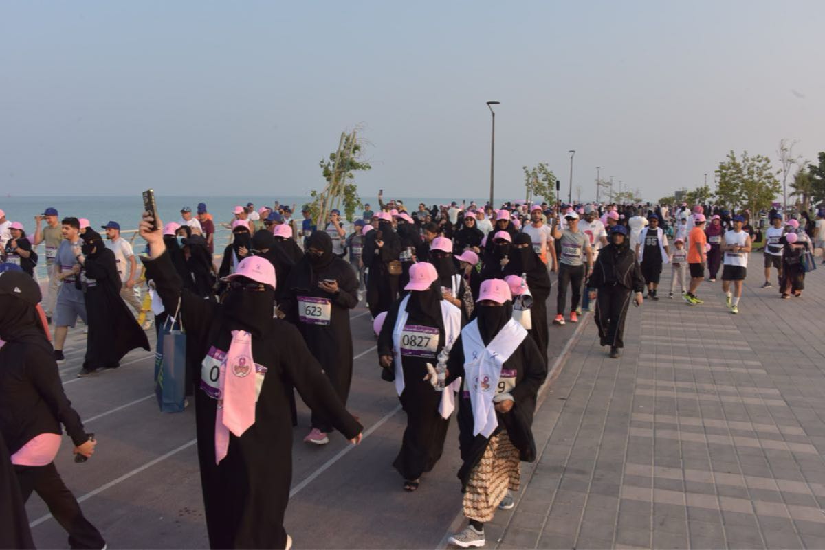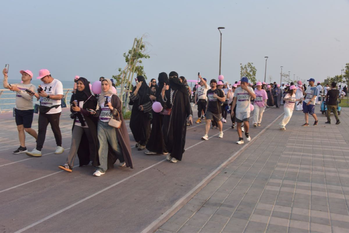 وشاركت جمعيات خيرية وجاليات متنوعة، وزينت سماء الكورنيش أكثر من 500 بالون وردي رمزاً للأمل. وتولت الجهات الأمنية والهلال الأحمر السعودي تنظيم السلامة وسير الحركة.