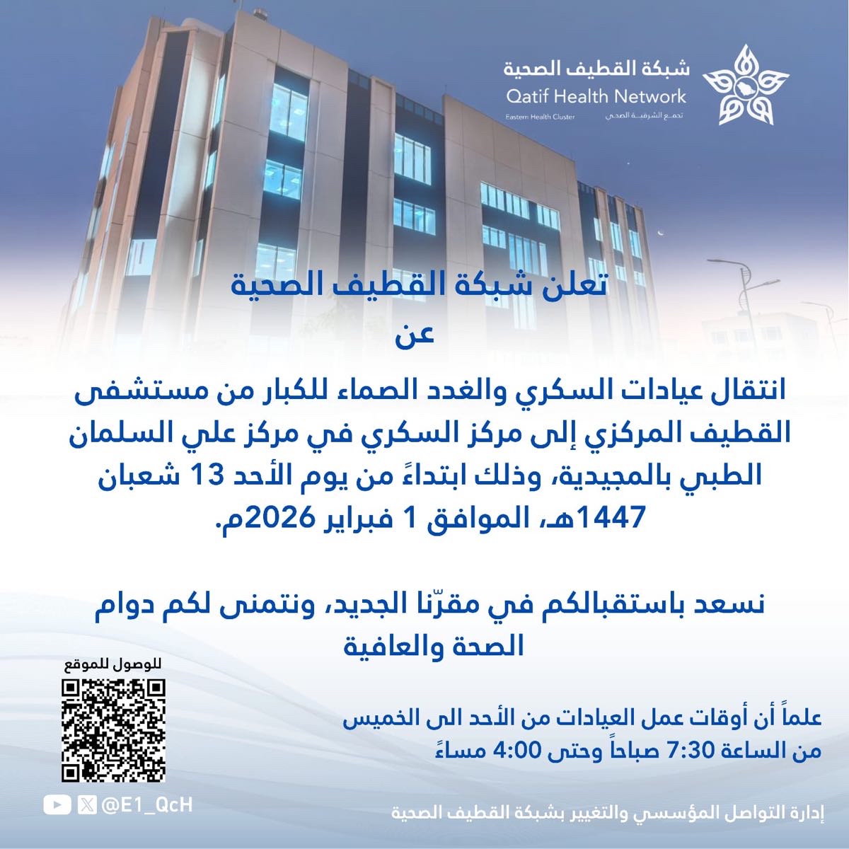 أعلنت شبكة القطيف الصحية عن نقل عيادات السكري والغدد الصماء للكبار من مقرها الحالي في مستشفى القطيف المركزي إلى مركز السكري بمركز السيد علي السلمان الطبي في حي المجيدية.