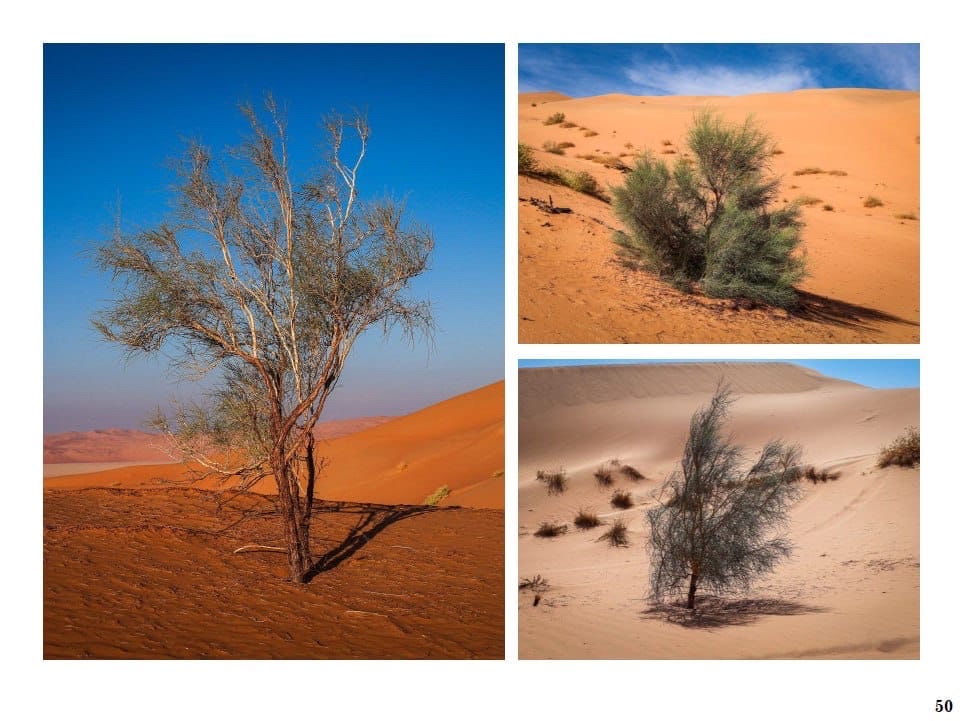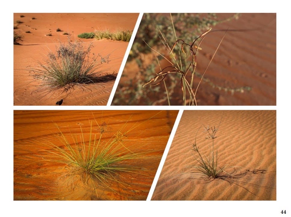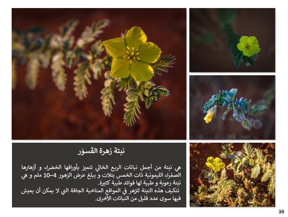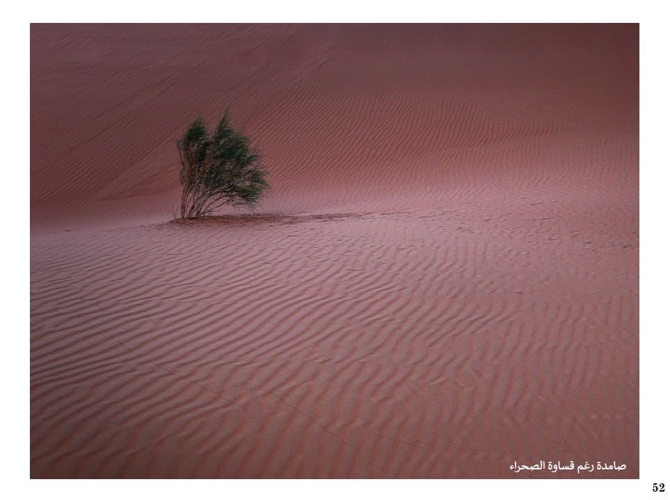 كما يبرز الكتيب صوراً لنباتات صامدة ومخلوقات تكيفت مع قسوة البيئة، في مشاهد تتجلى فيها ثنائية الموت والحياة بوضوح تام.
