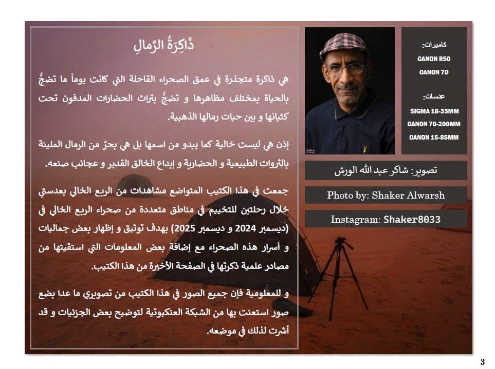وقدم المصور الفوتوغرافي شاكر الورش في أحدث إصداراته الفنية ”ذاكرة الرمال“ وثيقة بصرية فريدة تتجاوز مجرد التقاط الصور، لتغوص في عمق البعد الإنساني والتأملي لصحراء الربع الخالي.
