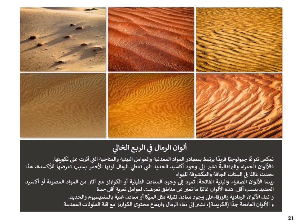 ويضم الكتيب مشاهد بصرية متنوعة توثق التضاريس الوعرة والكثبان الرملية ذات التكوينات المدهشة التي شكلتها الرياح ببراعة، مسلطاً الضوء على التباين اللوني للرمال تبعاً لمعادنها.