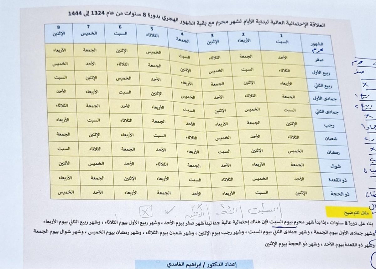 ذكر الدكتور إبراهيم الغامدي، المتخصص في الإحصاء الحيوي بجامعة الباحة بالمملكة العربية السعودية، أن هناك دورة ثابتة لبداية الشهور الهجرية تتكرر كل ثماني سنوات. وقال في لقائه مع جريدة الوطن السعودية إنه درس تقويم أم القرى من العام 1324 هـ إلى العام 1444 هـ، ولاحظ أن بداية الشهور تتكرر بنمط الثماني سنوات. وفي مكان آخر من هذا اللقاء قال الغامدي: إن هناك قاعدة يمكن أن تتوقع بداية شهر رمضان عندما تضيف خمسة أيام على تاريخ شهر رمضان للعام الماضي.