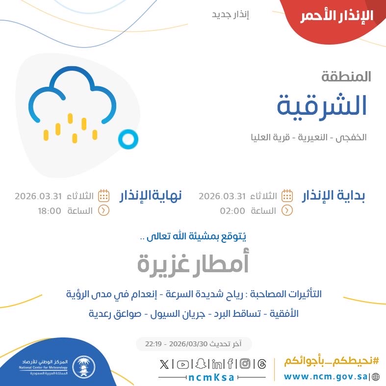 أطلق المركز الوطني للأرصاد ”الإنذار الأحمر“ محذراً من أمطار غزيرة وعواصف رعدية عنيفة تضرب 14 مدينة ومحافظة بالمنطقة الشرقية، في حالة مناخية استثنائية تستمر حتى ساعات الفجر.