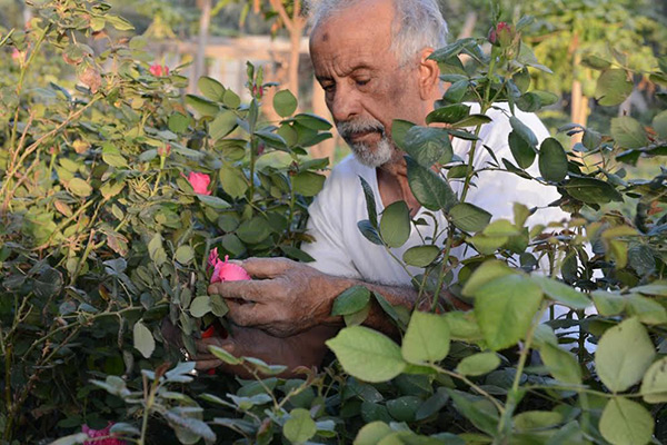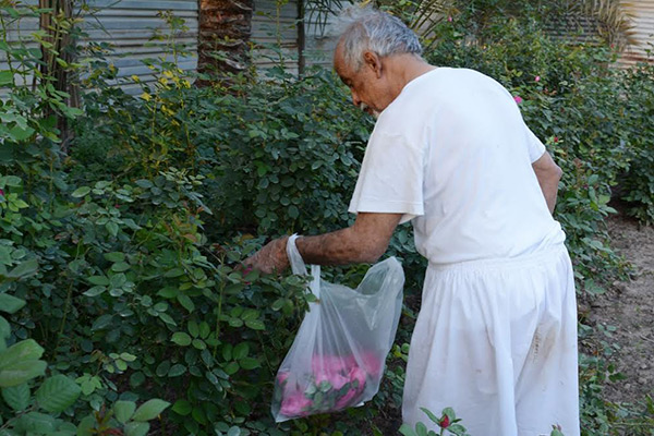 يزرع الحاج أبوجهاد الجارودي الورد المحمدي في مزرعته على مدار العام منذ ما يقارب العشرون عاماً ويصل قطافه اليومي منها 100 وردة مستثمراً إياها في التجارة.