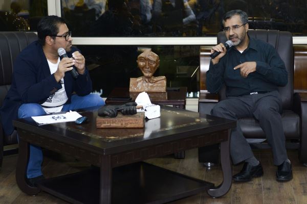 وأوضح العلوي أنواع الخشب التي يمكن استخدامها في النحت وعن الأزاميل وعلاقة النحت بالشعر والرسم، الذي كان يمارسه، مشيرًا إلى منحوتته للمسرحي عبد الله السعداوي، ومنحوتته بعنوان ”حنظلة القرن العشرين“ التي جاءت كتصور جديد لشخصية ”حنظلة“ ولرسام الكاريكاتير الفلسطيني ناجي العلي وغيرها من منحوتاته، ساردًا للحاضرين حكايتها.لقاء الكاتب عباس الحايك والنحات هاشم العلوي
