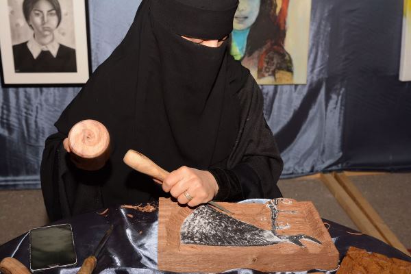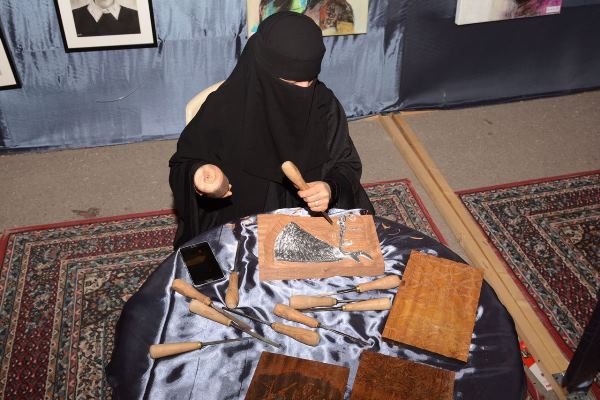 وأوضحت أنها تختار الشكل أو الرسمة التي ترغب بنحتها على لوح الخشب وتطبعها على ورق ثم تلصقها بواسطة غراء على اللوح، ومن ثم تبدأ بالنحت والصقل والتلوين.