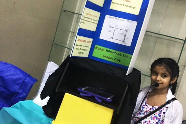 تحدت الطفلة ريحانة عبد العزيز اليحيى - 7 أعوام - العلوم والتكنولوجيا بإعداد تجربة في فناء المدرسة بتقنية الهيلوجرام ”ثري دي“، لتشرح فيها أطوار القمر وكيفية التحول لثلاثية الأبعاد.