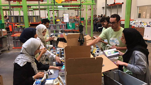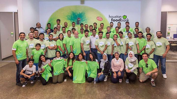 ووزع الطلاب الوجبات التي تبرعت بها شركة ارامكو السعودية في مدينة هيوستن بالتعاون مع بنك الطعام في أمريكا.