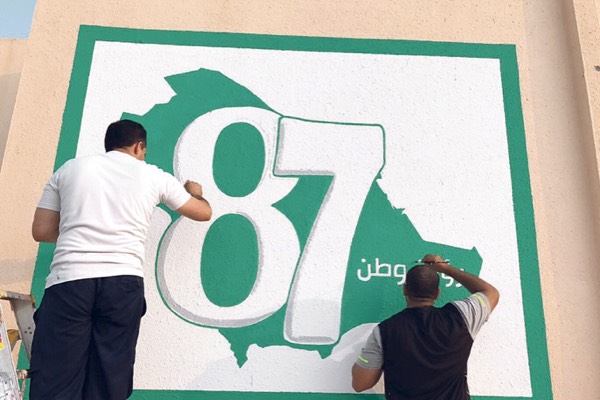 طبع طلاب مدارس العوامية في اليوم الأول من عودتهم لمقاعد الدراسة على جدار مدرسة ابتدائية البخاري بالعوامية شعار اليوم الوطني 87 والذي ستحتفل به المملكة الاسبوع القادم.
