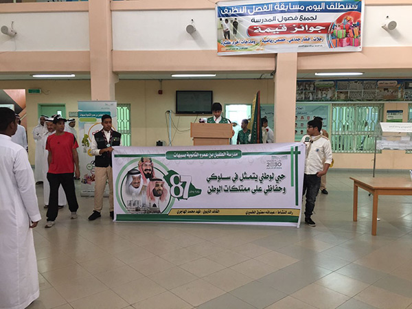 وتزينت مدارس محافظة القطيف بأعلام المملكة وصور خادم الحرمين الشريفين الملك سلمان بن عبدالعزيز، وولي العهد -.