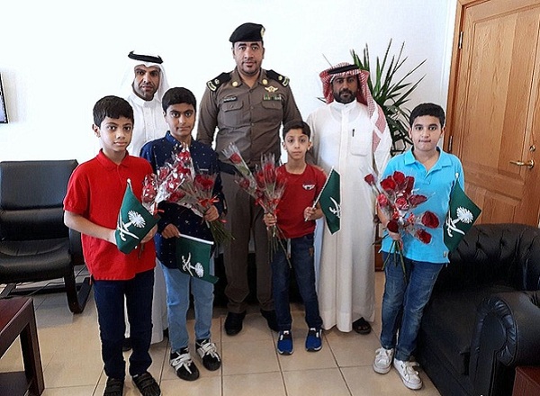 جال عدد من طلاب مدرسة اليرموك الابتدائية بصفوى يرافقهم المشرف عليهم الأستاذ حسن الجنبي الدوائر الحكومية المتواجدة بمركز صفوى، وبعض الأحياء لتوزيع الورود والأعلام، وذلك بمناسبة اليوم الوطني 87 للمملكة.