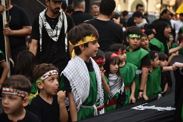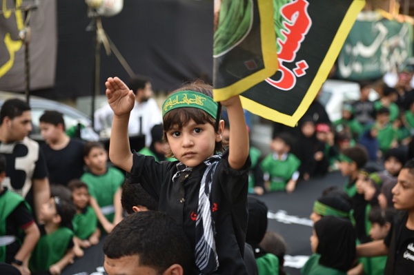 وتوشح الأطفال بزيٍ موحد تمثل في اللونين الأسود والأخضر، وعصابات حسينية على الجبين، هاتفين بشعاراتٍ ولائية مؤكدين بها على رسالتهم «نحن نحب الرضيع ودمه لن يضيع»، «لبيك ياحسين لبيك يارضيع» و«خذ حتى ترضى».
