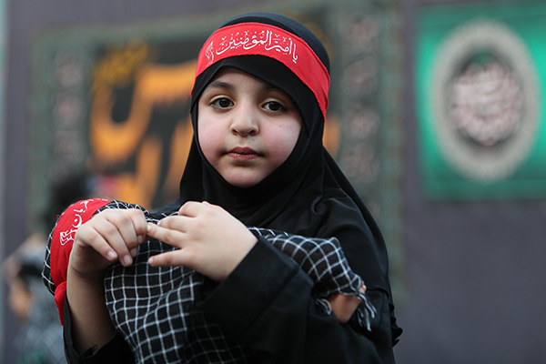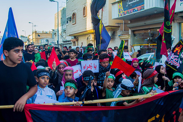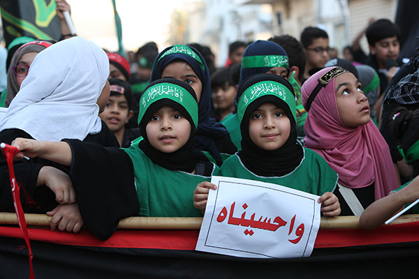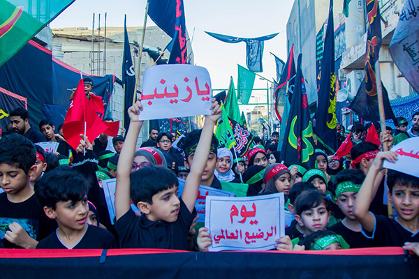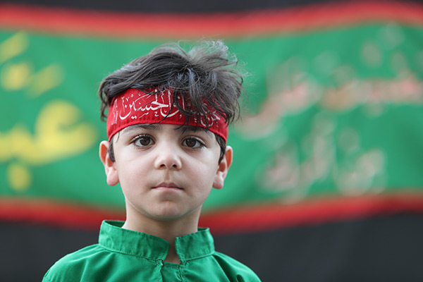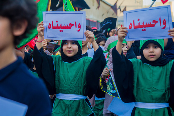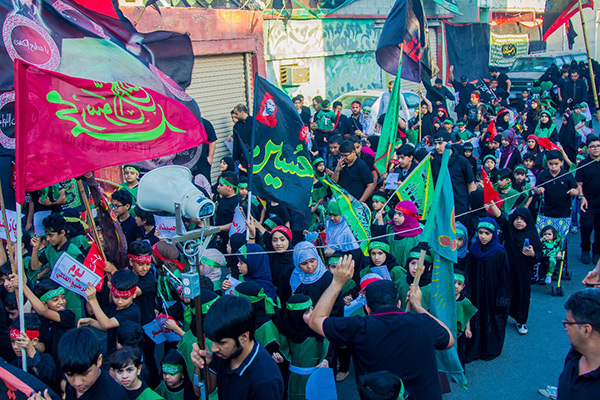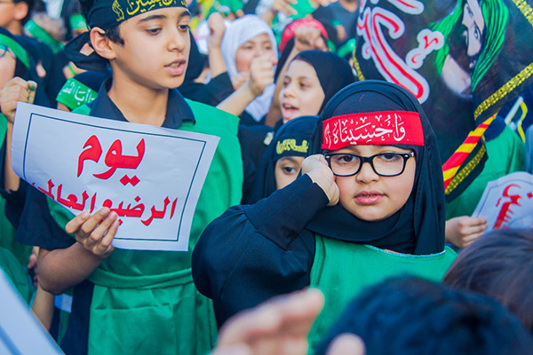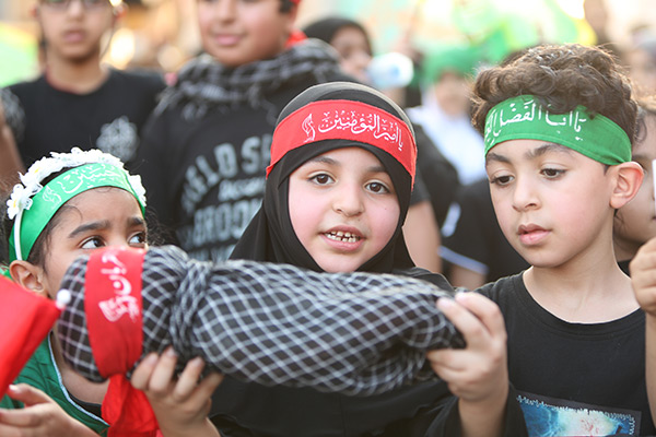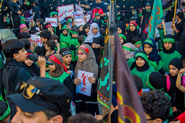 واتشح الأطفال في هذه المسيرة باللونين الأخضر والأحمر، وأخذوا يلوحون بباقات الريحان والأعلام وهم يهتفون بالتلبية للحسين ويجددون عهدهم مع الطفل الرضيع.