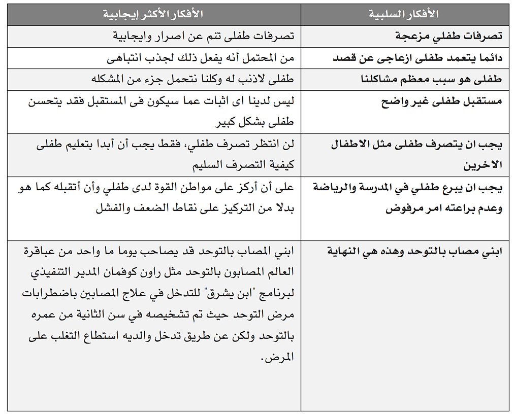 كما ذكرنا فى السابق أن الطريقة التى يفكر بها الأبوان لها تأثير بالغ على سلوك الطفل حيث تنعكس تلك الأفكار على نمط التفاعل بين الطفل ووالديه وأيضا بين الطفل ومجتمعه ككل. وإذا ألقينا نظرة على طبيعة نمو الطفل فى مراحل عمره المختلفة نجد أنه يتأثر كَثِيرَاً' بكلمات المحيطين به بل وأحيانا قد تتسبب تلك الكلمات فى وقوع ضرر نفسى على الطفل فقد تشعره بالدونية وبالاستهانة بمشاعره وعدم العناية بها