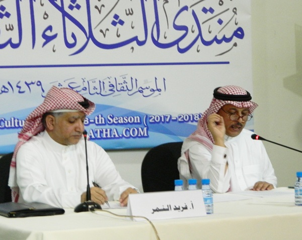 استضاف منتدى الثلاثاء الثقافي الدكتور حسن النعمي أستاذ السرديات بجامعة الملك عبد العزيز بجدةوسط حضور من الأدباء والكتاب وشعراء المنطقة في ندوته الثانية من الموسم الثقافي الثامن عشر تحت عنوان ”العلاقة بين الشعر والسرد... قراءة ثقافية“.