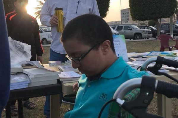 مارس الطفل حسن الرميح - ذو العشرة أعوام - شغفه بالقراءة في ”بسطة كتب“ ولم تمنعه الصعوبات، مجسداً بذلك أن الإعاقة تكون في الفكر والعقل لا الجسد.